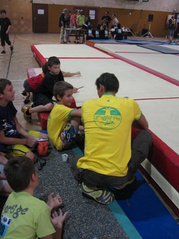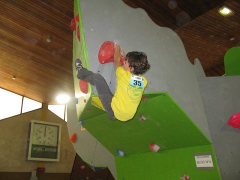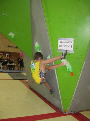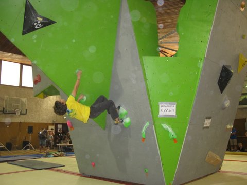 Les poussins clôturent la journée par le bloc. ILIANN tient le choc et rate d’un cheveu son 6ème bloc mais avec 5 blocs à vue il boucle magistralement cette épreuve à la deuxième place. La fatigue aidant, Loic accuse un peu le coup et doit sortir les griffes et s’y reprendre à trois fois pour sortir son quatrième blocs et en rate malheureusement deux autres avec le bac final en main. Avec quatre blocs au compteur il se classe 10 ème.