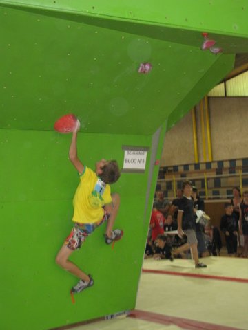 Les poussins clôturent la journée par le bloc. ILIANN tient le choc et rate d’un cheveu son 6ème bloc mais avec 5 blocs à vue il boucle magistralement cette épreuve à la deuxième place. La fatigue aidant, Loic accuse un peu le coup et doit sortir les griffes et s’y reprendre à trois fois pour sortir son quatrième blocs et en rate malheureusement deux autres avec le bac final en main. Avec quatre blocs au compteur il se classe 10 ème.