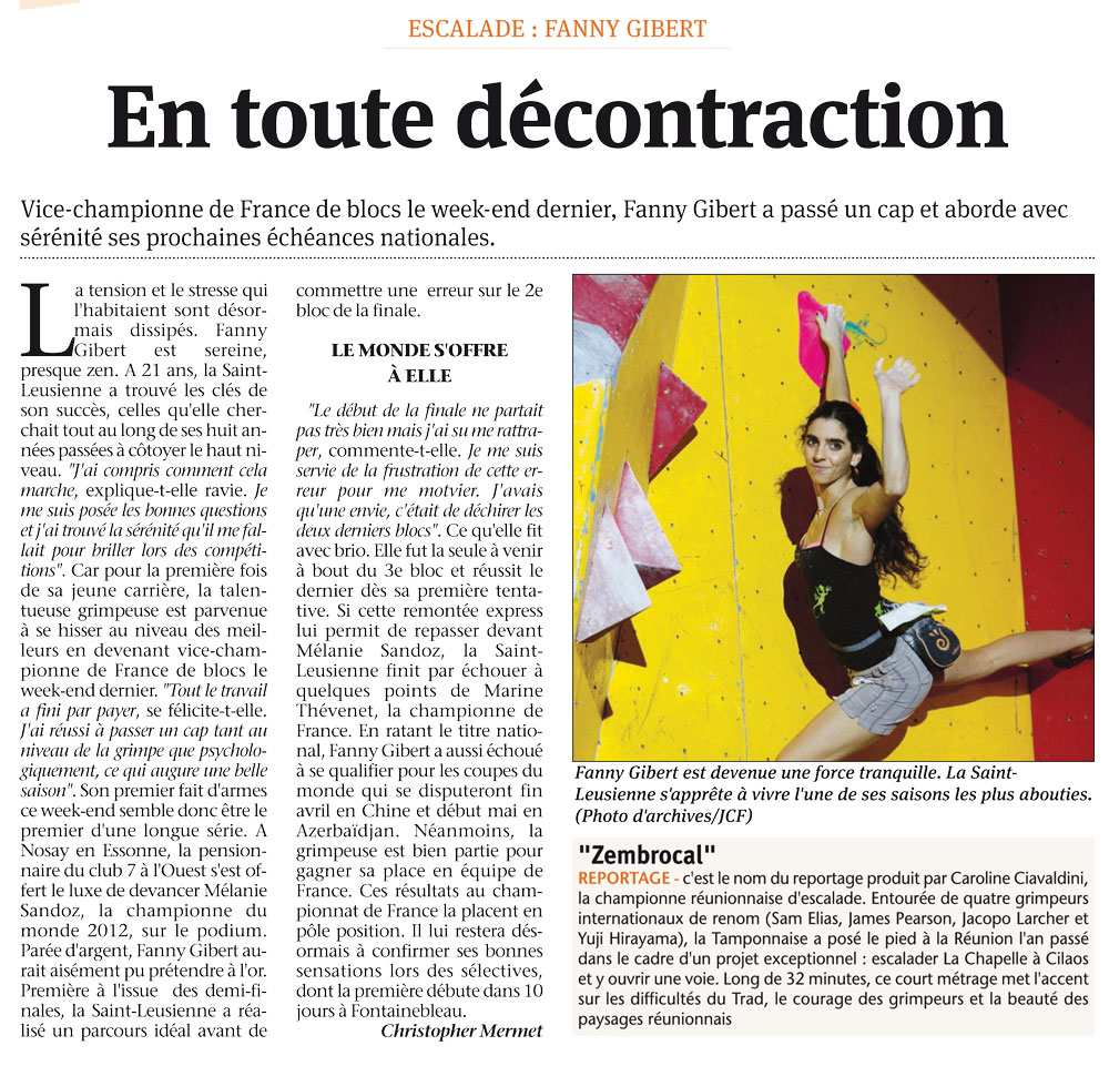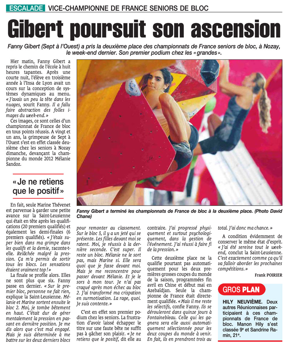 « Je crois qu’il m’a juste manqué un peu de lucidité dans le deuxième bloc. Peut-être un peu trop de pression… C’est aussi surement ce qui m’a permis d’enchainer les deux blocs suivants : la frustration du bloc 2 m’a donné des ailes. Cela dit, je suis vraiment contente de cette compétition, de la réalisation de ce pour quoi je m’entraine autant. La saison commence à peine, elle promet de belles choses. »