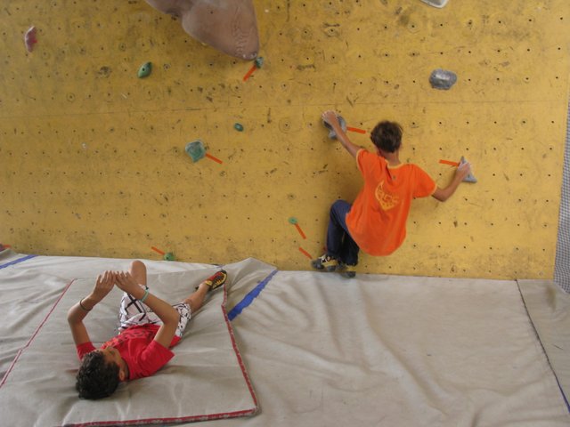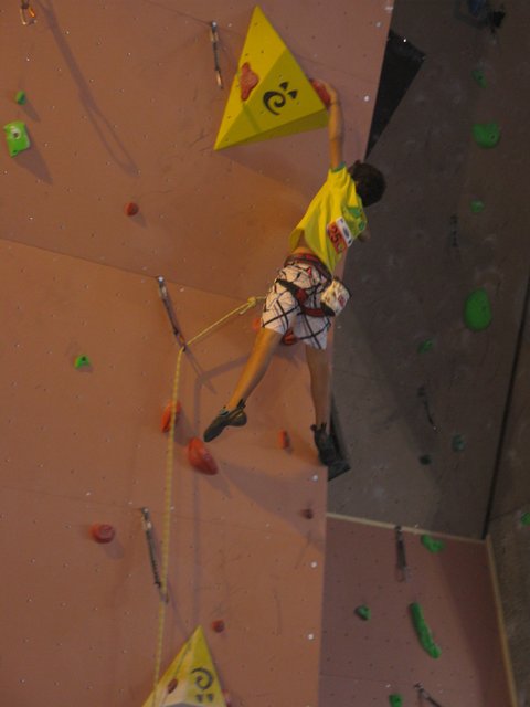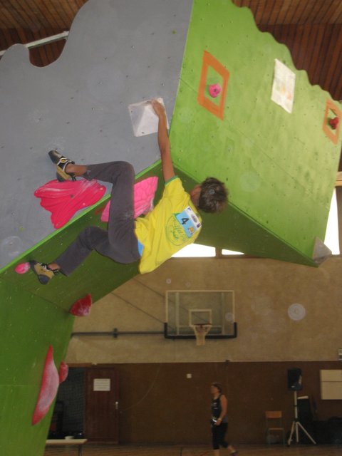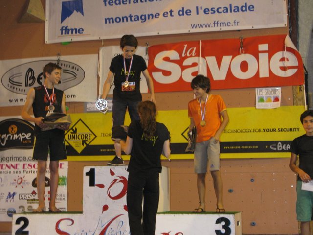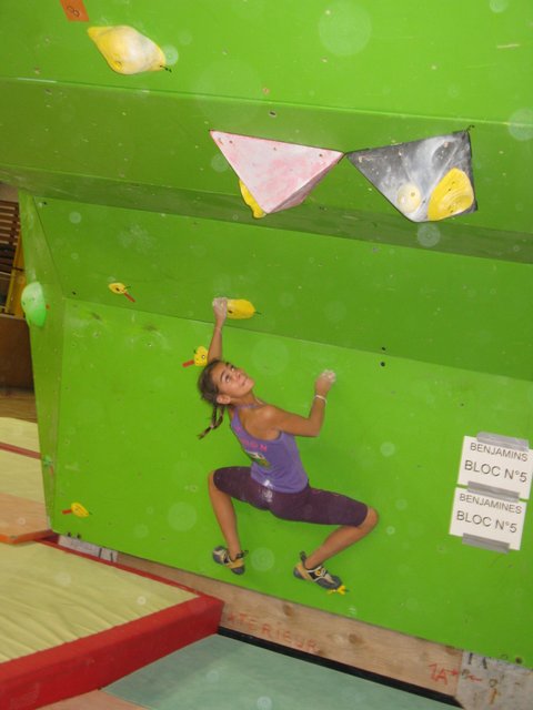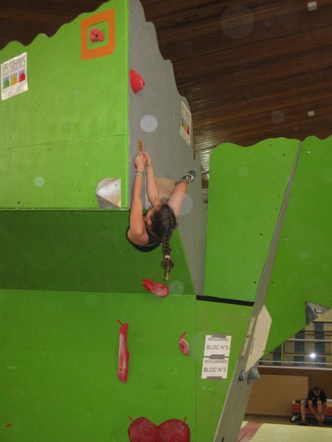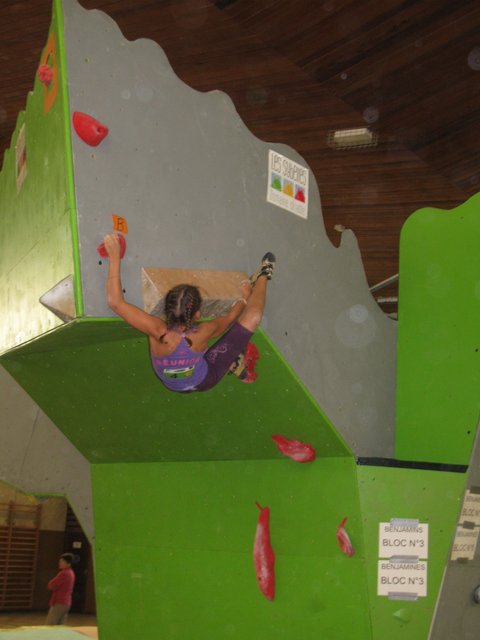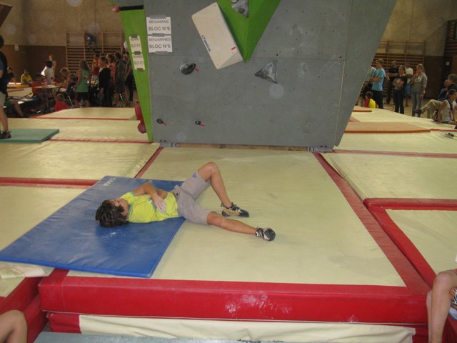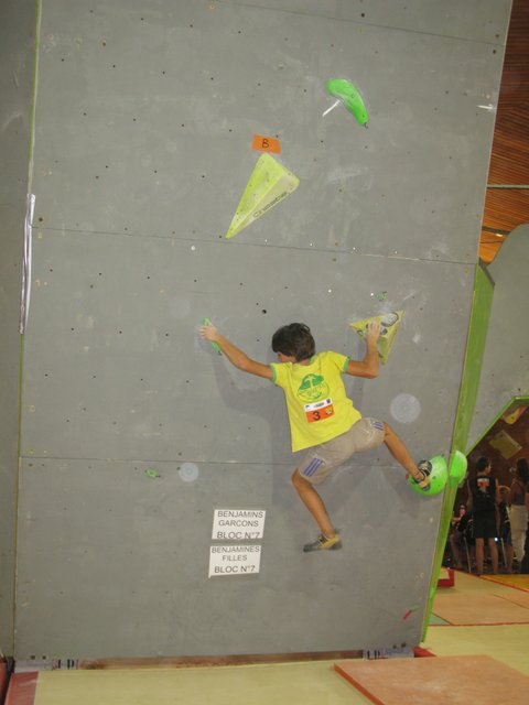 Le contest de bloc attend encore les benjamins pour finir cette journée toute aussi éprouvante pour les coachs que pour les grimpeurs. La fatigue se fait sentir mais il faut encore tenir pour espérer une bonne place au classement général. Loic (14ème) en a « plein les bottes », il repart avec 4 blocs en 6 essais. Iliann aussi est « bien entamé » et lâche d’entrée un essai dans un bloc moyen qui lui coûtera fort cher pour le classement général. Il se ressaisit et bataille dans les blocs les plus durs où il échouera d’un rien. Il prend finalement la 6ème place.