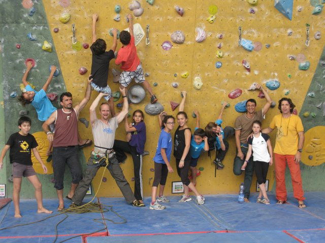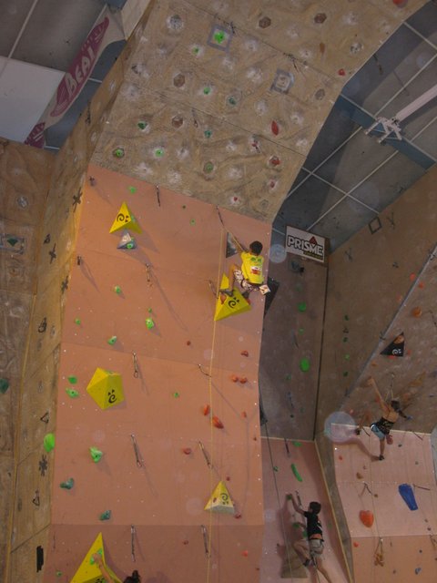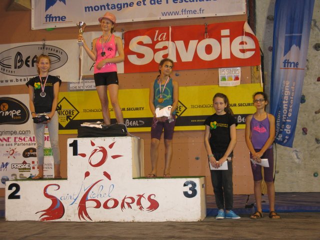 Kintana démarre par le bloc, elle ne démérite pas en réalisant cinq blocs à vue et manque d’un cheveu l’un des blocs très durs du contest ce qui la place en 5ème position pour cette première épreuve. Pendant ce temps les poussins sont à la vitesse ; Titouan « limite la casse » avec une 8ème place. Les benjamins et les benjamines s’affairent dans les voies de difficulté : Iliann réalise les trois voies avec brio dont un 7b+ bien physique dans le gros devers centrale du mur de St Michel des Maurienne. Loic pourtant en grande forme à l’entraînement, ne grimpe pas à son niveau et tombe dans la deuxième voie, il chutera aussi prématurément dans le gros devers de la troisième voie. Solène ne s’en laisse pas compter et sa belle prestation dans le grand dévers la positionne en 3ème place. Laura empoche la 7ème place avec un mousquetonnage oublié en fin de voie trois ce qui la pénalise. Lisa tombe avant d’atteindre le relais de la voie 2 et manque un peu d’assurance dans le grand devers, elle obtient la 15ème place.