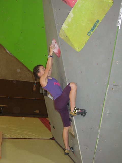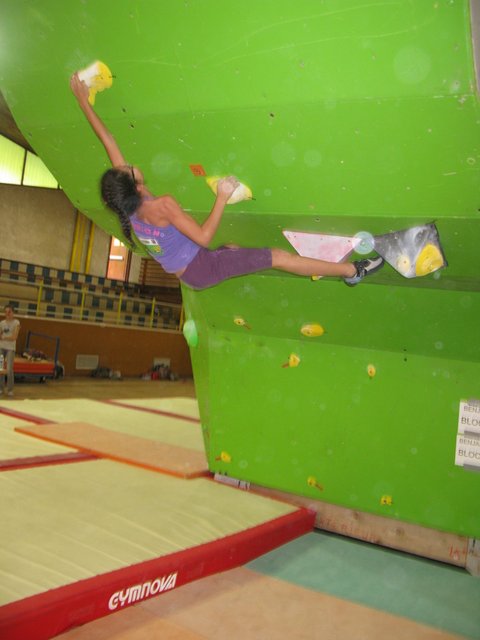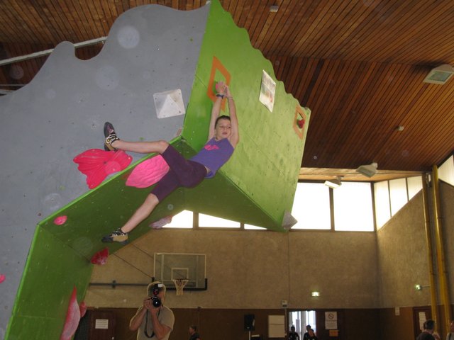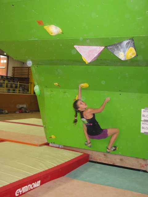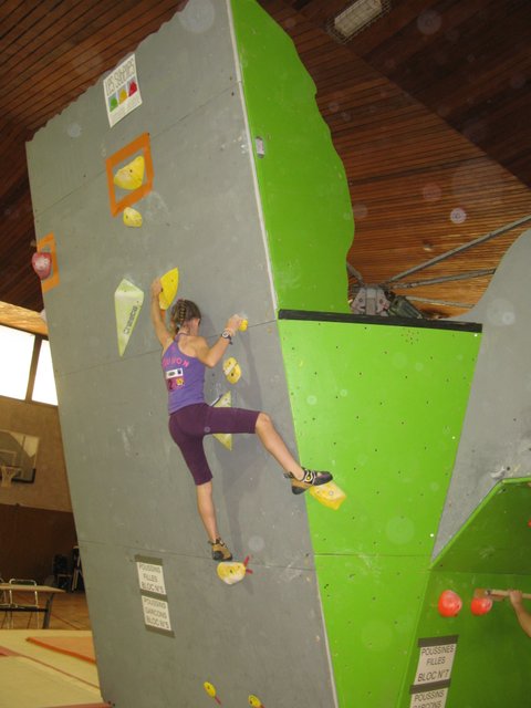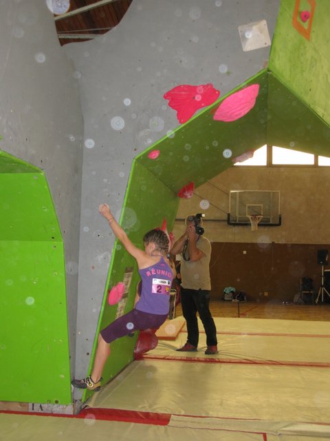 Laura (4ème) et Solène (5ème) font un très bon parcours durant le contest de bloc tant dit que Lisa (11ème) a plus de mal à trouver ses marques. Laura passe tout près de l’exploit en tombant avec les mains dans le bac final du 6ème bloc et en montant très haut dans le bloc 7 (qui ne sera pas réalisé).