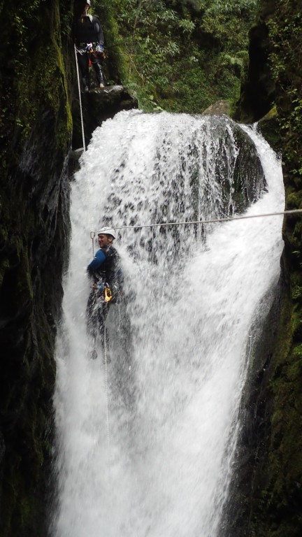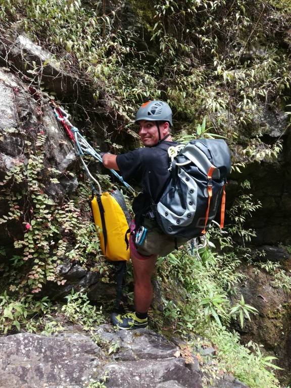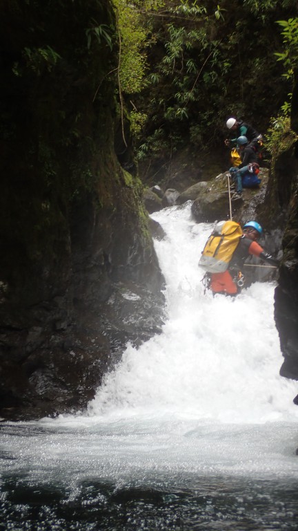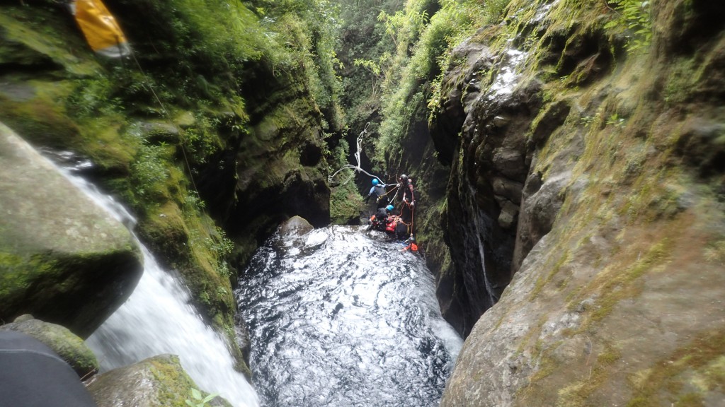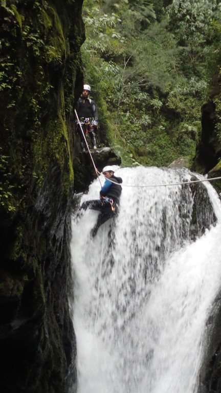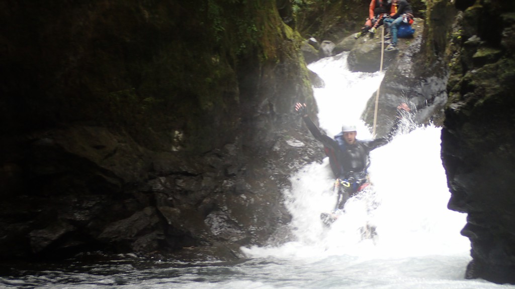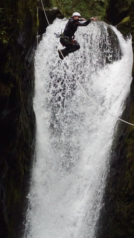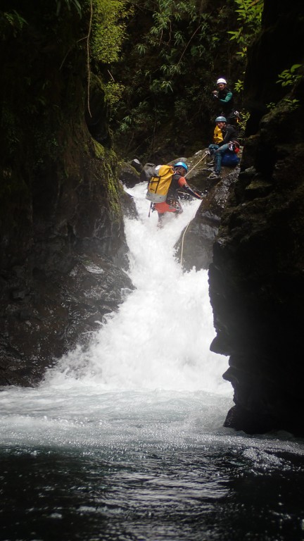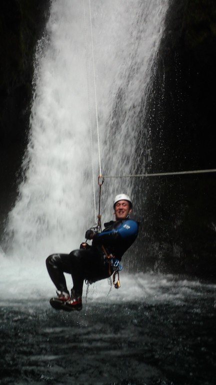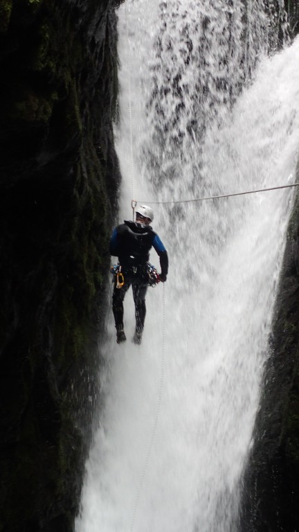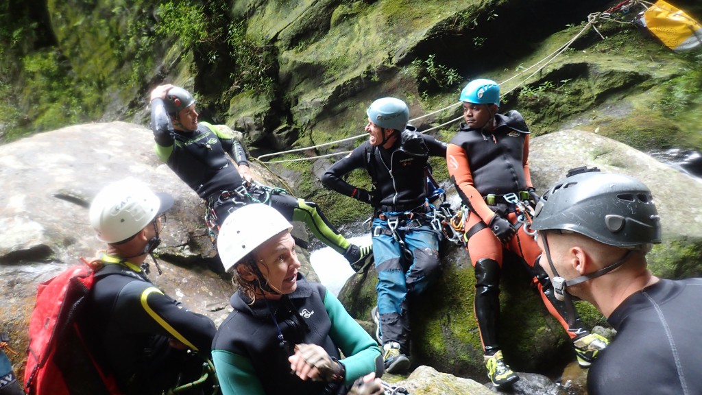 Au réveil, les équipes s’organisent, le bivouac démonté, on se dirige alors vers un grand galet collectif pour envoyé un rappel guidé de 100m. Bon les combinaisons sentent un peu le boucané, mais l’ambiance est au beau fixe, on se régale.