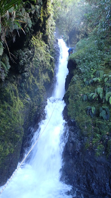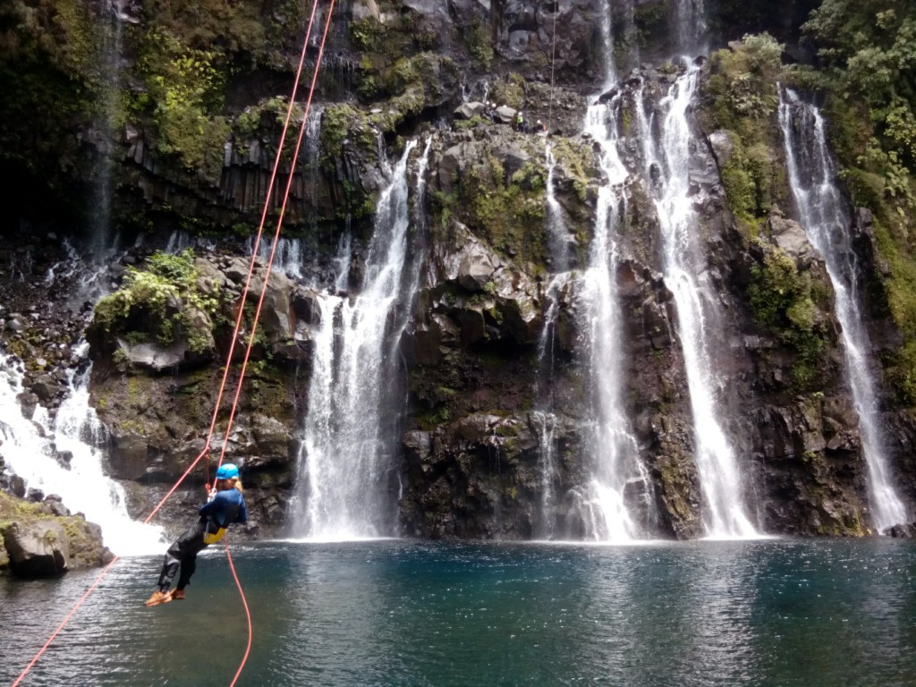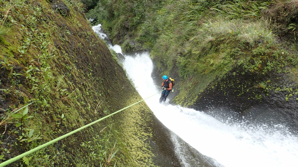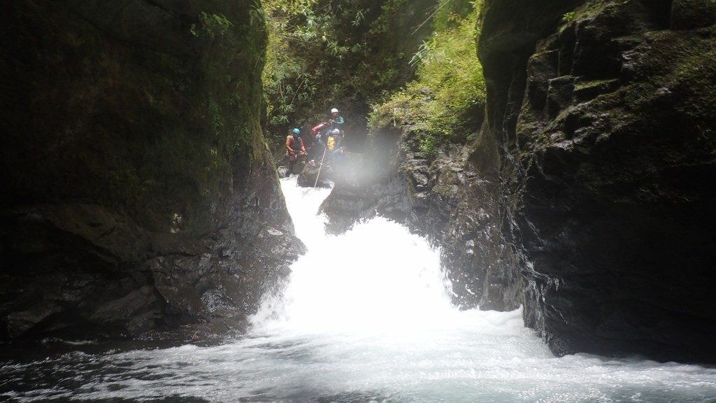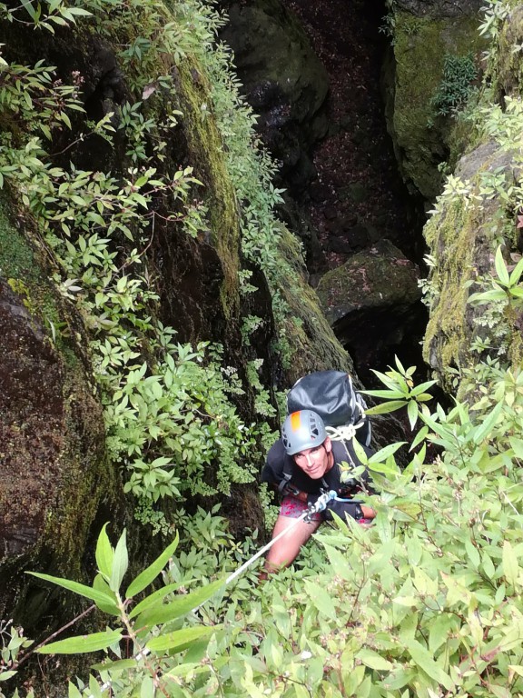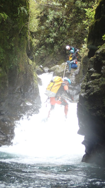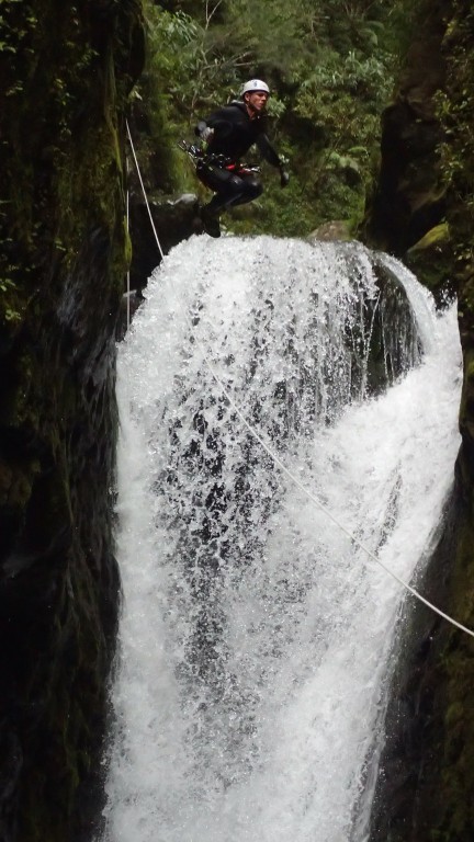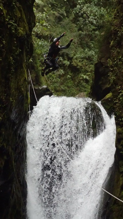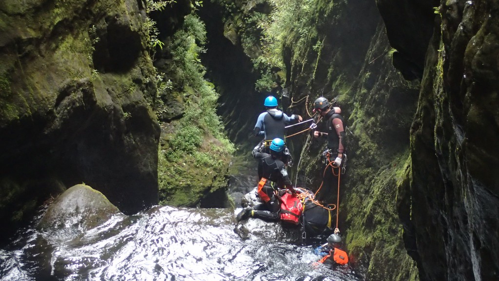 Au réveil, les équipes s’organisent, le bivouac démonté, on se dirige alors vers un grand galet collectif pour envoyé un rappel guidé de 100m. Bon les combinaisons sentent un peu le boucané, mais l’ambiance est au beau fixe, on se régale.