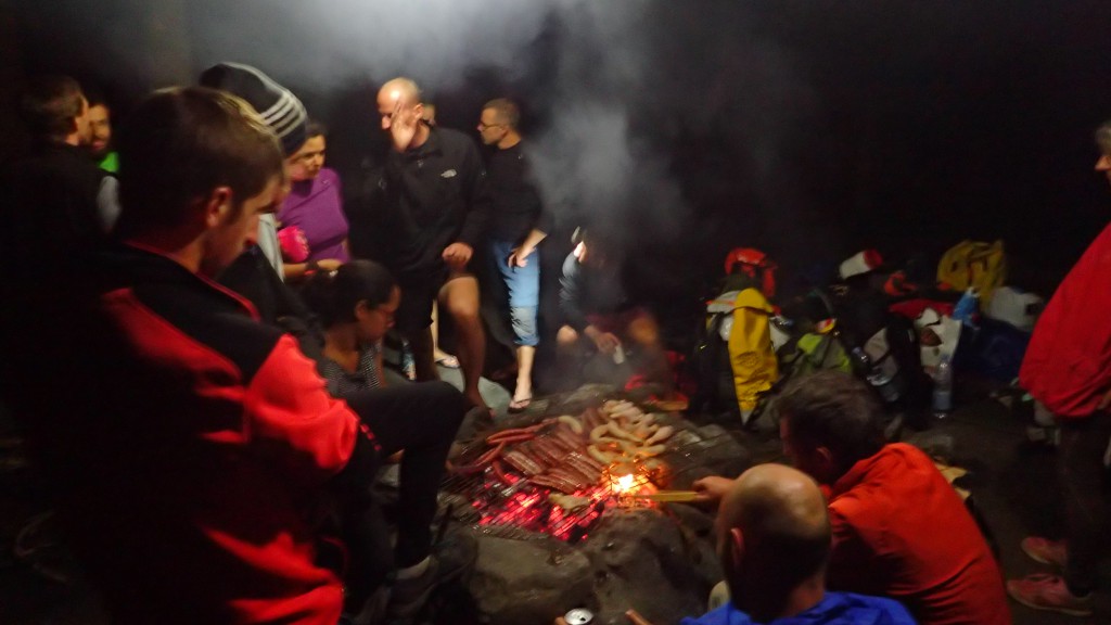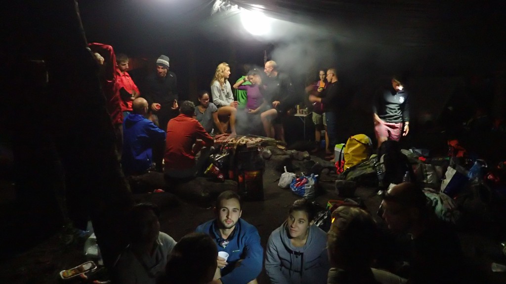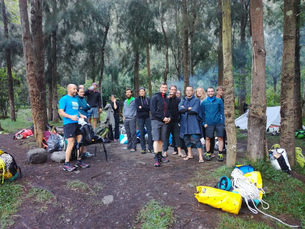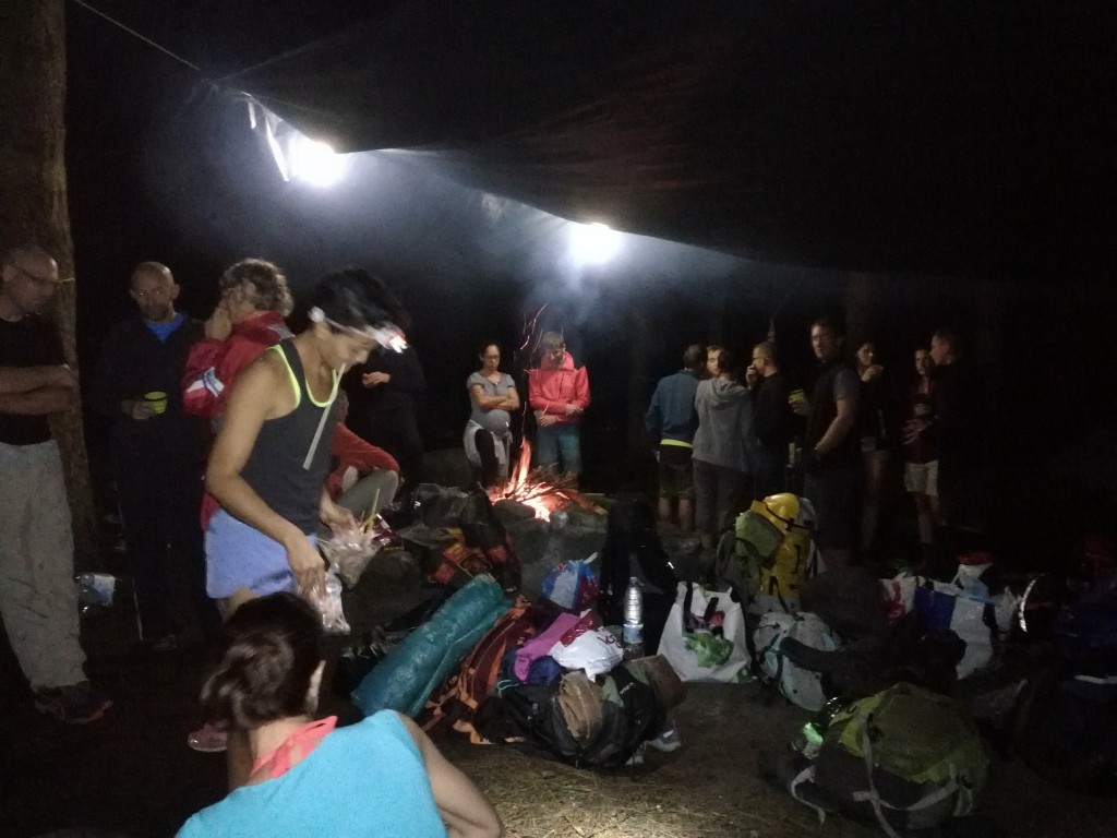De retour au bivouac, une petite pluie fine a alors vicieusement tenté de nous décourager. Mais les bâches du campement installé par « Extrême Verticale » tiennent le coup. Les gens se rapprochent, une petite musique se fait entendre et la potion magique d’Arnaud renforce l’équipe !