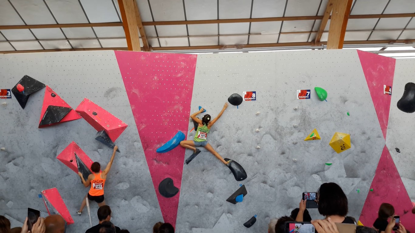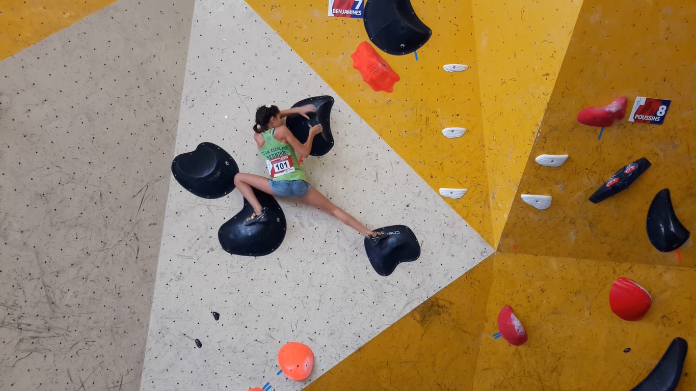 Oriane BERTONE (club 7A l’ouest) remporte le titre magistralement en benjamine en s’imposant dès le lancement de la compétition avec la réussite de toutes les voies proposées de l’épreuve de difficulté dont deux 7C+/8A. Oriane poursuit sa démonstration durant la deuxième épreuve en réalisant l’ensemble des 8 blocs proposés en 9 petits essais et en s’offrant aussi la deuxième place de l’épreuve de vitesse (à seulement un centième de la première). Elle s’impose comme véritable leader de cette nouvelle génération.