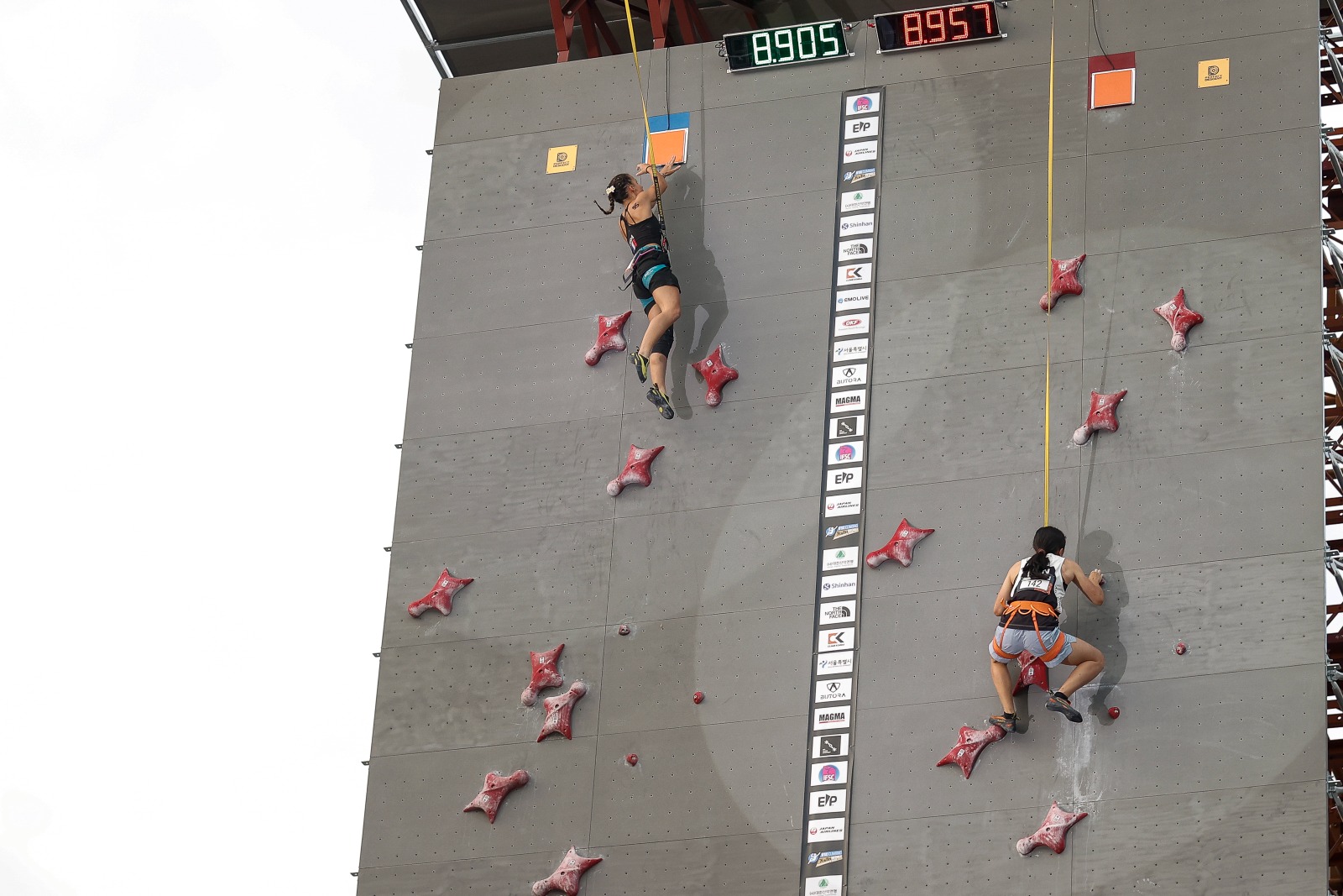 En vitesse, Eva Lina RYMASZ (Austral Roc) et Louise FONTAINE (Est’Kalad Club) se sont respectivement qualifiées pour les finales U16 et U18. Malgré un temps de 8sec59, Eva Lina s’incline en huitième de finale et se classe 9e. Louise, quant à elle, remporte son premier duel et accèdera aux quarts. Elle terminera 8e de la compétition.