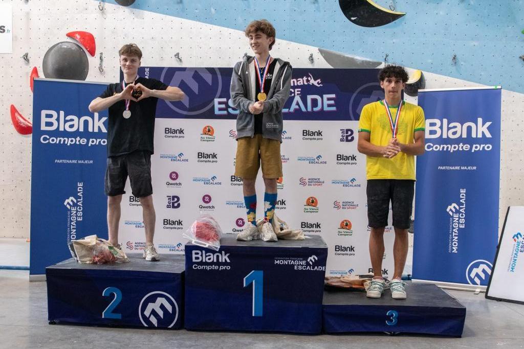 Sam POULLAIN (7a L’Ouest), double champion de France en titre (U18 et U20) et membre de l’équipe de France de bloc Jeunes cette année, avait fort à faire. Une grosse frayeur avec une « zipette » au début de sa première voie de qualification ne le fait pas débuter la compétition de la meilleure des manières. Il arrive cependant à se remobiliser et arrive à bout de sa deuxième voie de qualification. Il se classe 8e du classement provisoire, synonyme de qualification en finale ! Le lendemain, il progresse bien et prend la tête du classement après son passage. Seuls deux concurrents arriveront plus haut que Sam ; Mattéo SOULE remporte le titre devant Victor GUILLERMIN. Pour ses derniers Championnats de France jeunes, le grimpeur du Pôle Espoir de la Réunion monte sur la 3e marche du podium et remporte une belle médaille de bronze !