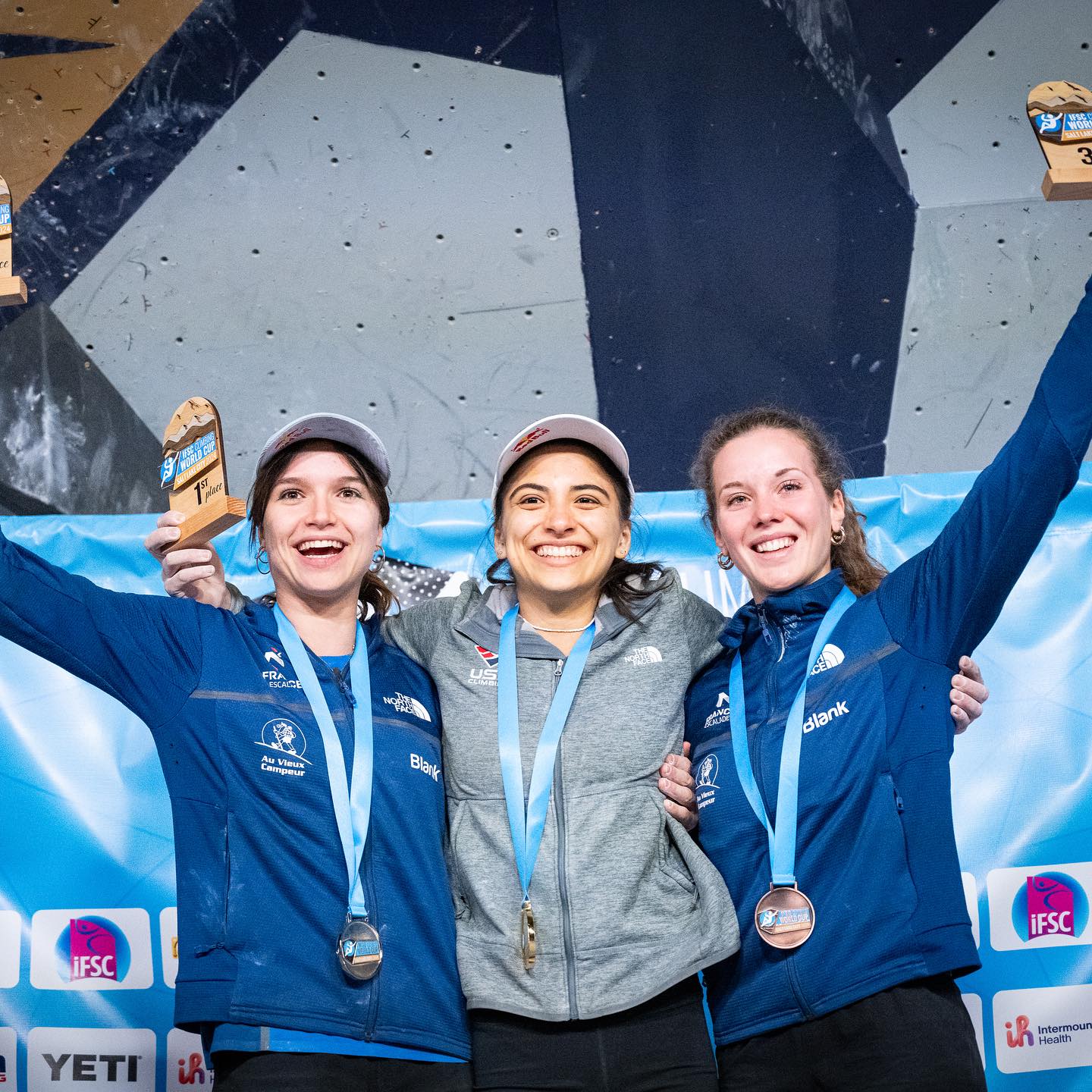 Sam POULLAIN (7a L’Ouest), double champion de France en titre (U18 et U20) et membre de l’équipe de France de bloc Jeunes cette année, avait fort à faire. Une grosse frayeur avec une « zipette » au début de sa première voie de qualification ne le fait pas débuter la compétition de la meilleure des manières. Il arrive cependant à se remobiliser et arrive à bout de sa deuxième voie de qualification. Il se classe 8e du classement provisoire, synonyme de qualification en finale ! Le lendemain, il progresse bien et prend la tête du classement après son passage. Seuls deux concurrents arriveront plus haut que Sam ; Mattéo SOULE remporte le titre devant Victor GUILLERMIN. Pour ses derniers Championnats de France jeunes, le grimpeur du Pôle Espoir de la Réunion monte sur la 3e marche du podium et remporte une belle médaille de bronze !