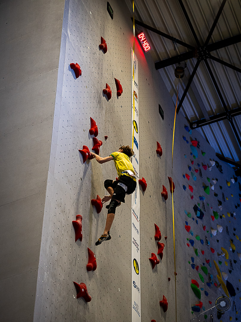 En U16, Elena PASTUREL (Est’Kalad Club) et Léo GROSSET (Austral Roc) remportent tous les deux la compétition. Elena, qui améliore ses temps passage après passage (10sec57 en finale) monte sur la plus haute marche du podium pour sa première compétition nationale de vitesse. Léo quant à lui bat son record personnel en 6sec34 (il flirt à 5 centièmes du record de France de la catégorie) et se montre régulier tour après tour, avant de l’emporter.