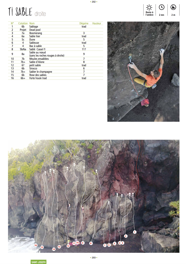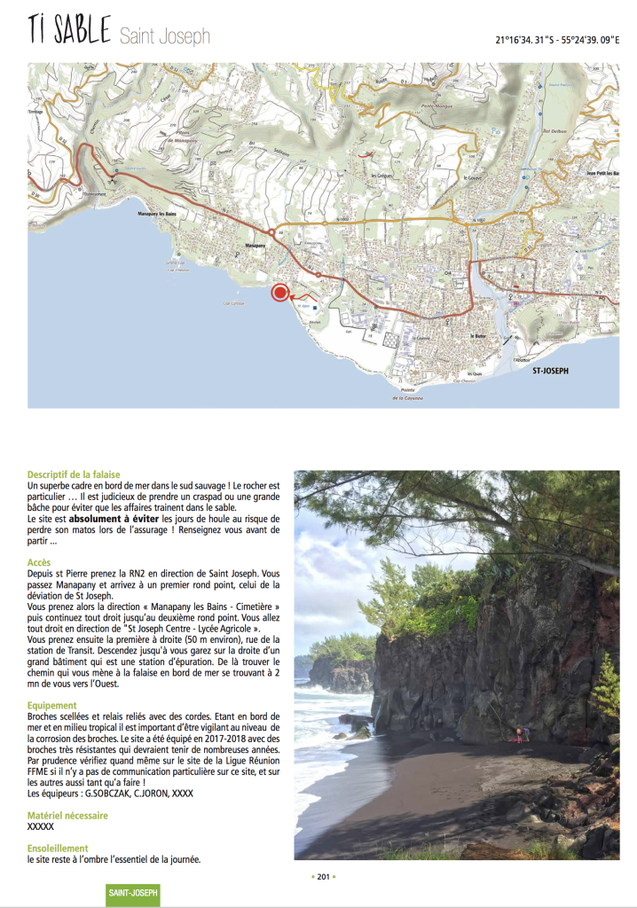 Voici le topo de la nouvelle falaise de Ti Sable, à St Joseph, équipée par G.Sobczak. Ce topo est un topo provisoire, non exhaustif, les cotations sont à affiner, confirmer … il s’agit d’un extrait du futur topo falaise de La Réunion.