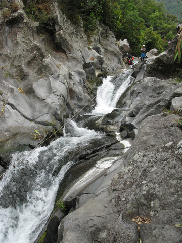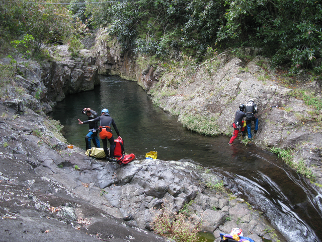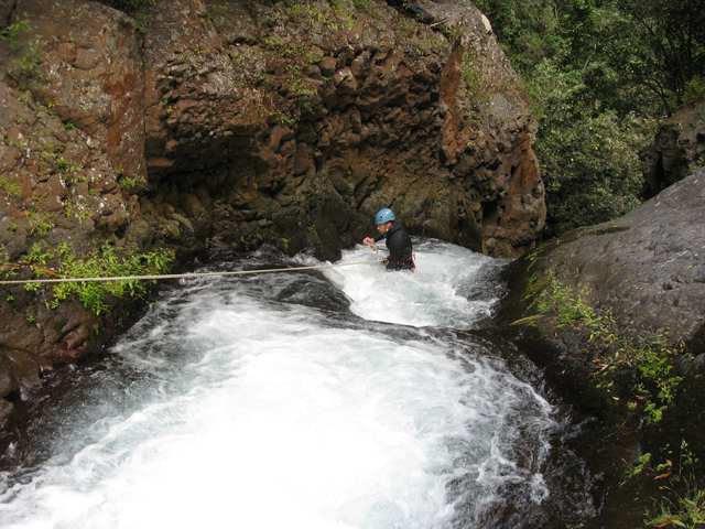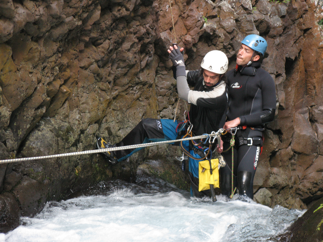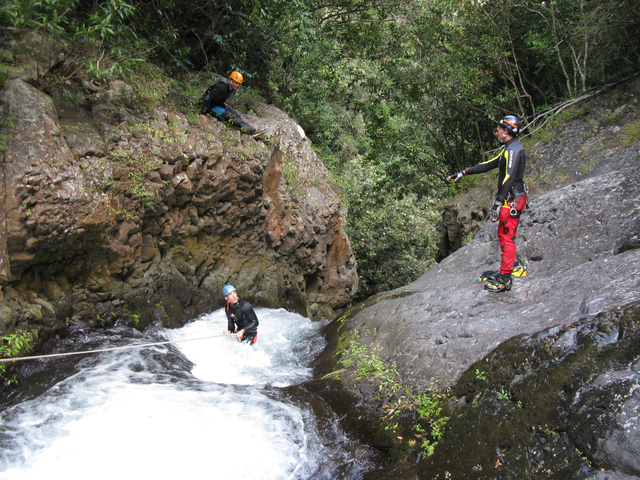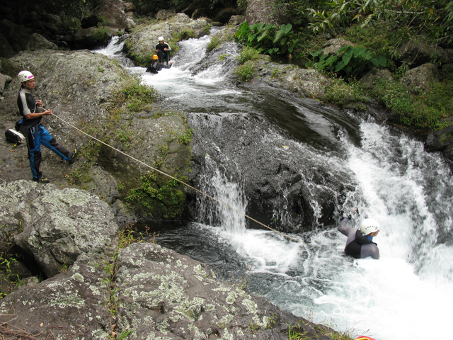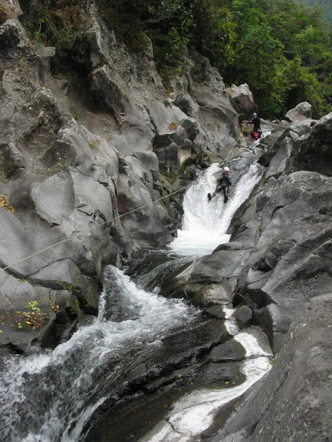 Après avoir transféré leurs affaires au gîte Sery, les huit canyonistes du stage  partent à la découverte du canyon de Grand Bassin, un canyon à dominante aquatique avec des toboggans d’envergure et quelques drossages bien sentis. Une fois de plus les cadres en profitent pour rééquiper ce canyon afin d’offrir des franchissements variés, l’idéal pour effectuer un travail technique de qualité. Une soirée fort sympathique clôture cette journée autour d’un bon carry pays avec un petit rhum arrangé pour faire passé tout ça. Après le repas,  les cours théoriques s‘ enchaînent. Sébastien Jay a pris soin d’apporter son ordinateur pour nous présenter son exposé sur powerpoint.